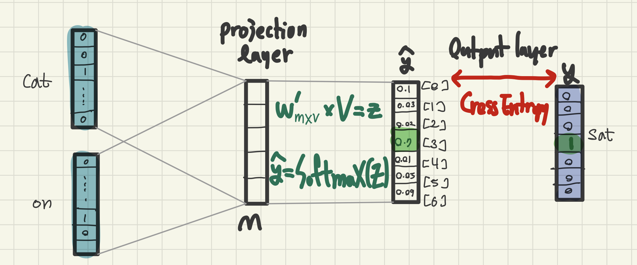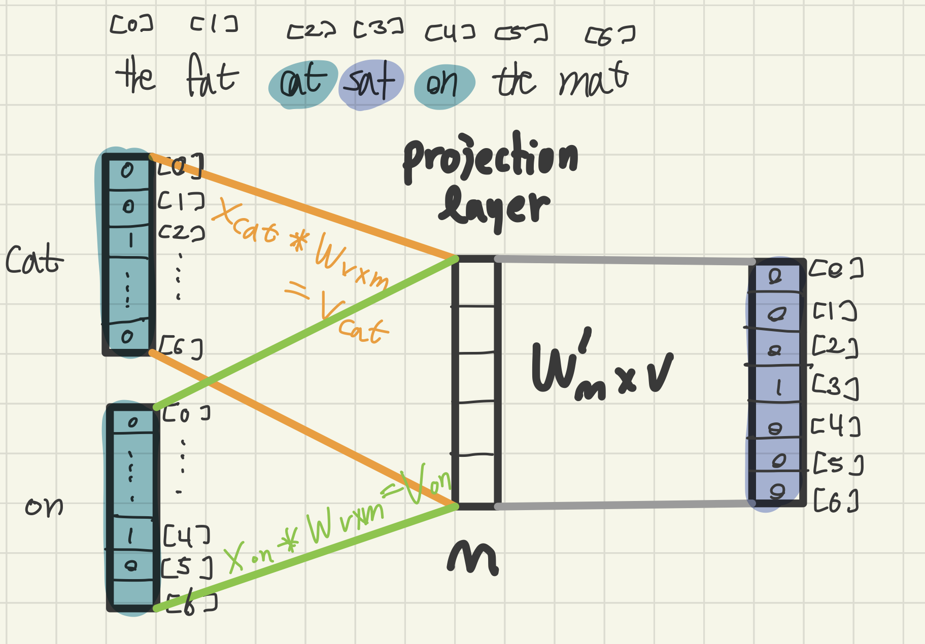 - cat,fat의 one-hot vector의 크기가 V(그림에서 V=6), 투사층의 크기는 M(그림에서 M=5)이다