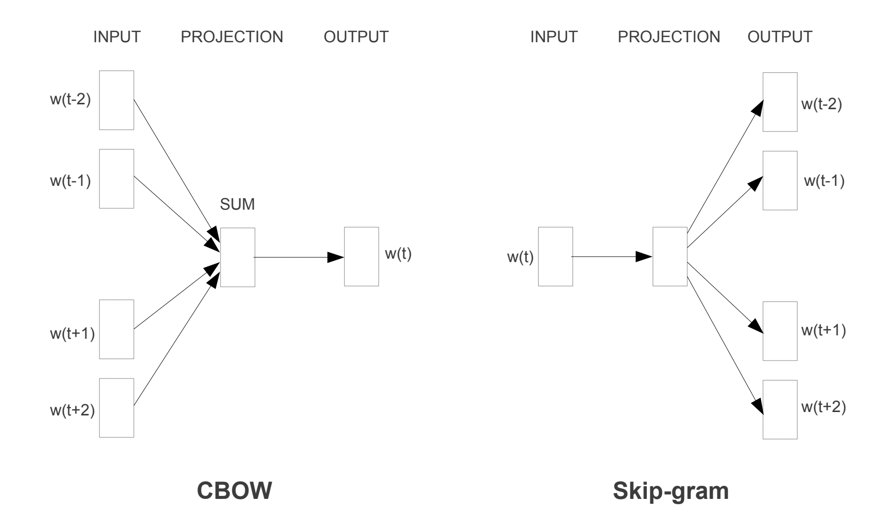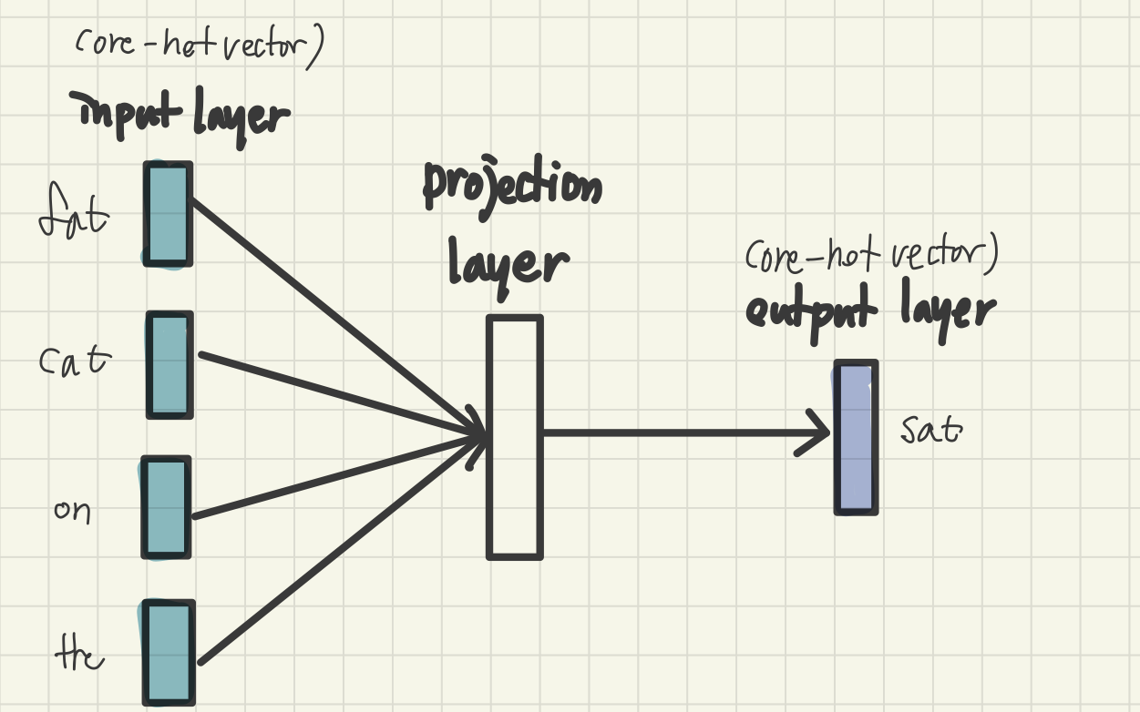 - 그 결과 window의 크기가 n이라고 했을 때 2n개의 임베딩 벡터들이 생성되고, 이들은 투사층에서 만나 이 벡터들의 평균인 벡터를 구하게 된다