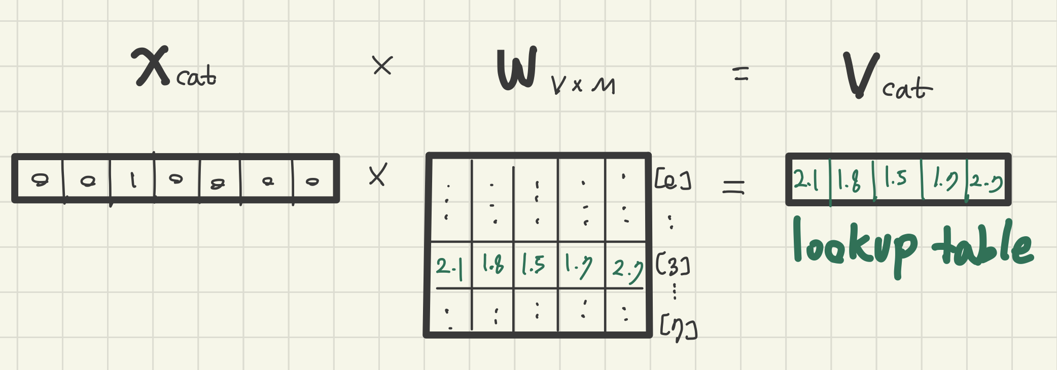 [3] -> [2] / [7] -> [6] 로 수정 - 입력 벡터는 one-hot vector이므로, 이를 가중치 W와 곱하면, 결국 W 행렬의 i번 째 행을 그대로 읽어오는 것과 동일하다