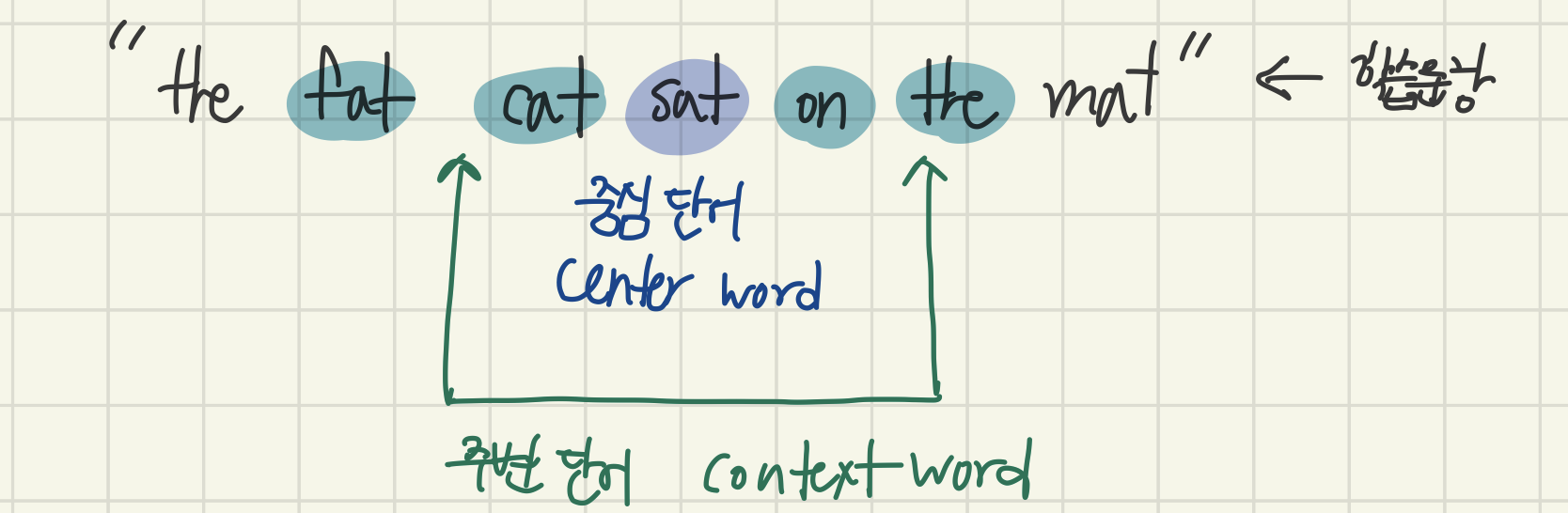 - 즉, "The fat cat sat on the mat"이라는 문장이 있을 때 sat을 예측하는 것