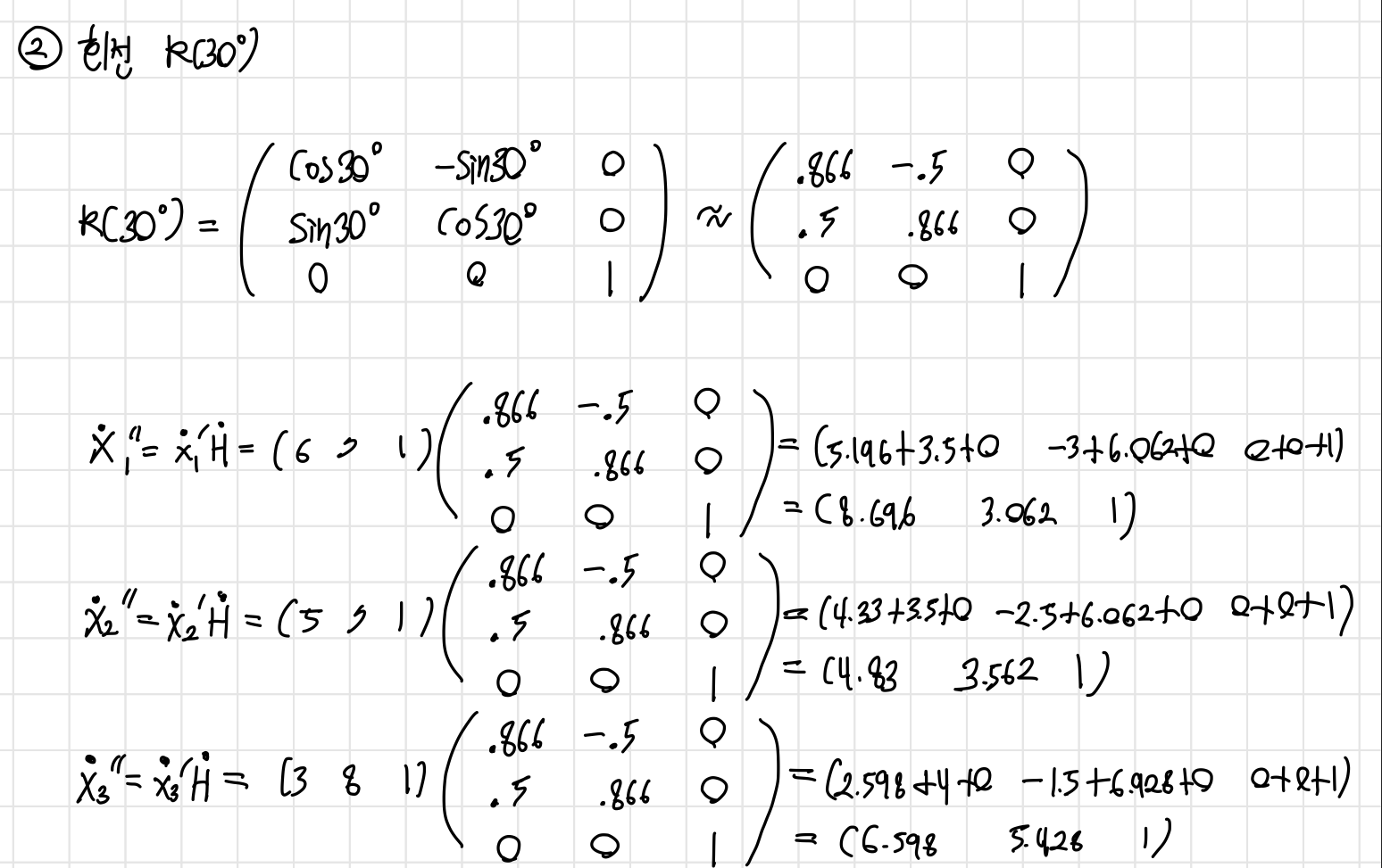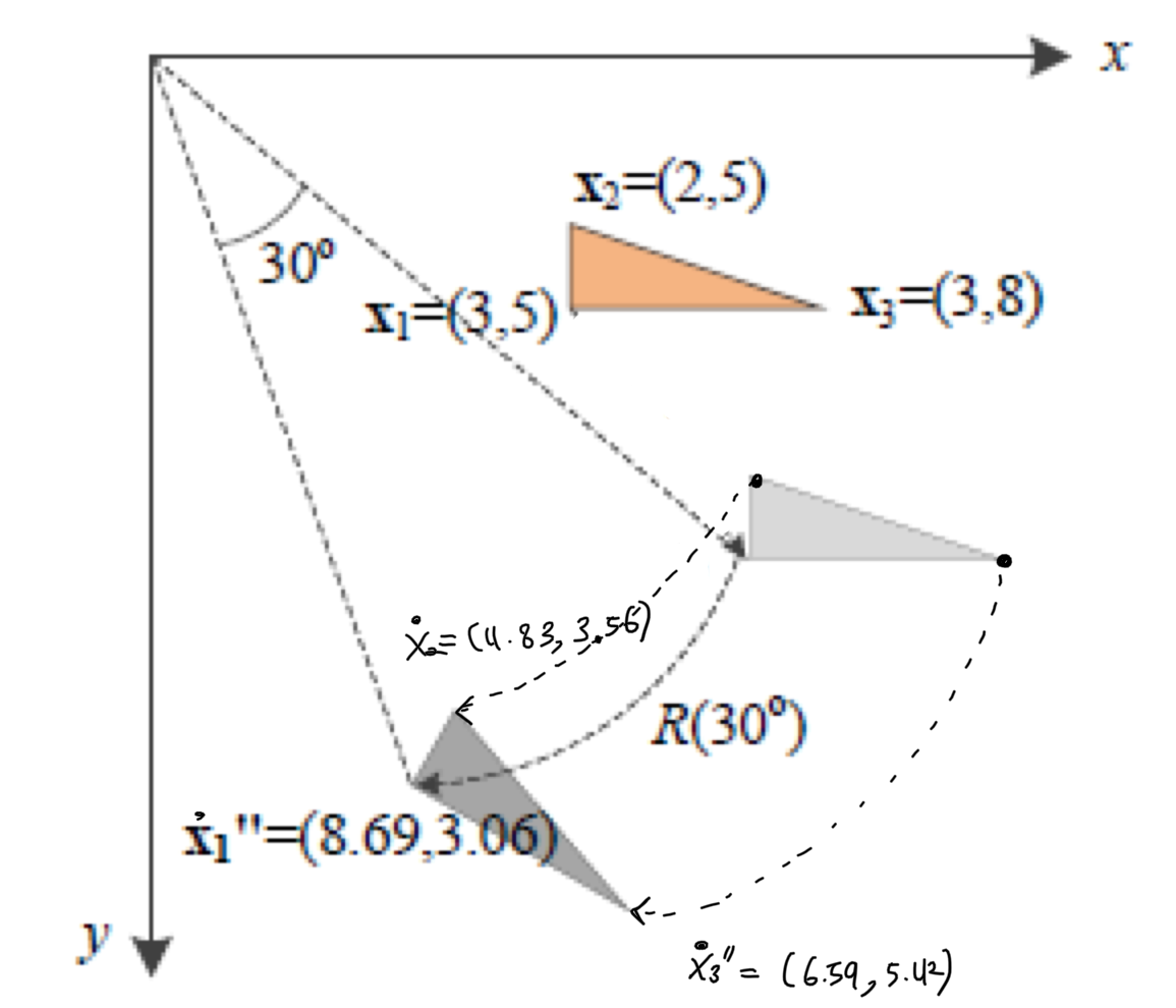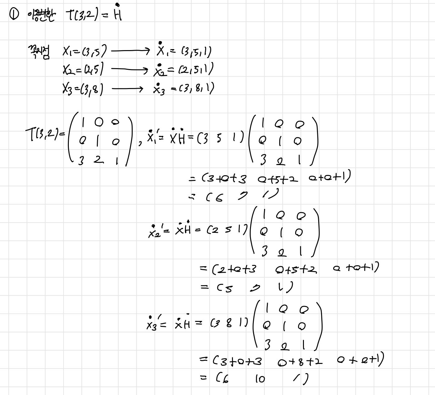 - 그림에서 x2" = (7.83 3.562 1), 변환된 x3는 (6 10 1)로 x3" = (9.196 5.66 1) 계산 결과 정정하겠습니다 :)