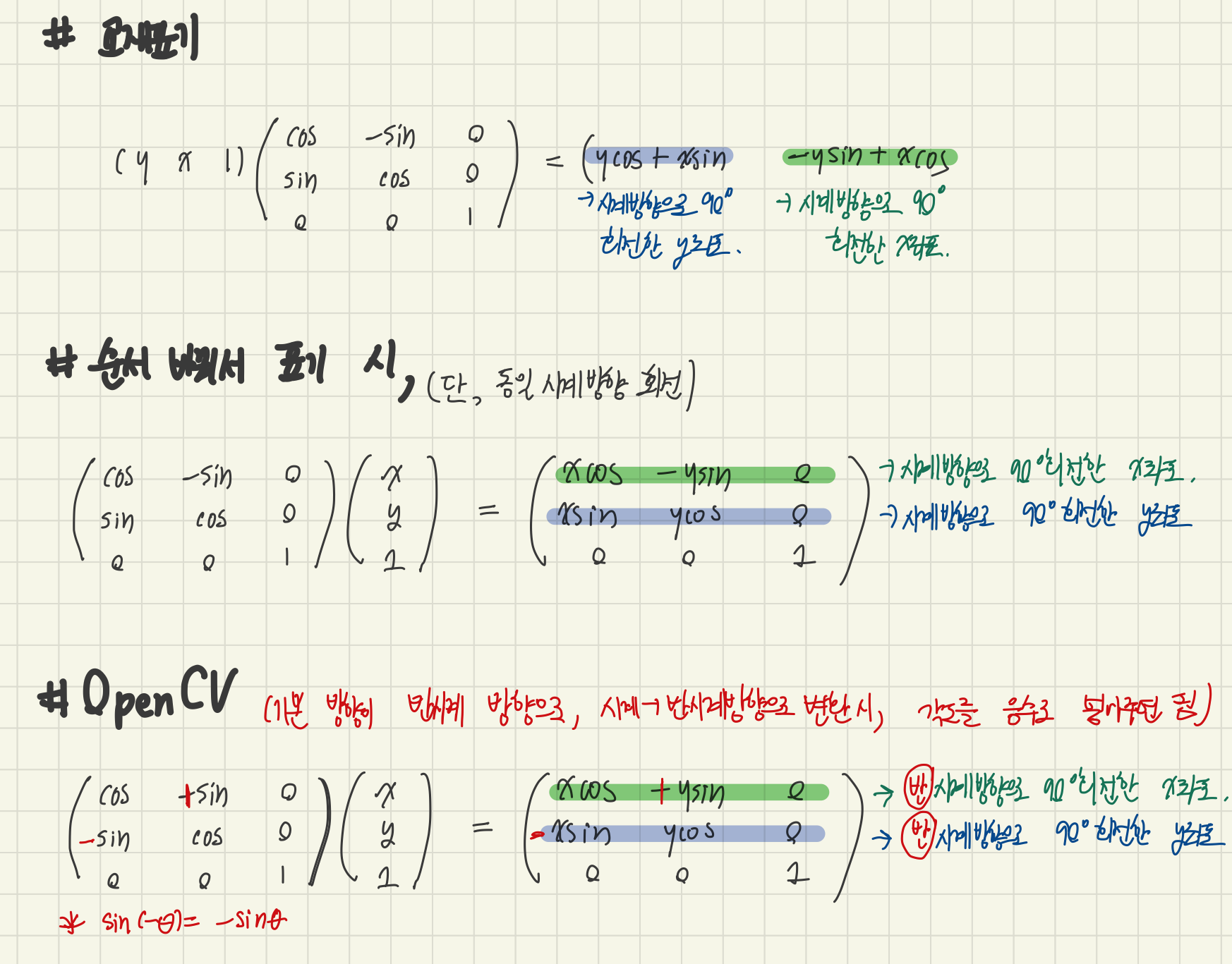 - 먼저 회전축으로 중심을 옮겨준 후, 세타만큼 회전을 진행. 이 후 다시 원래 중심(0,0)으로 옮겨줌