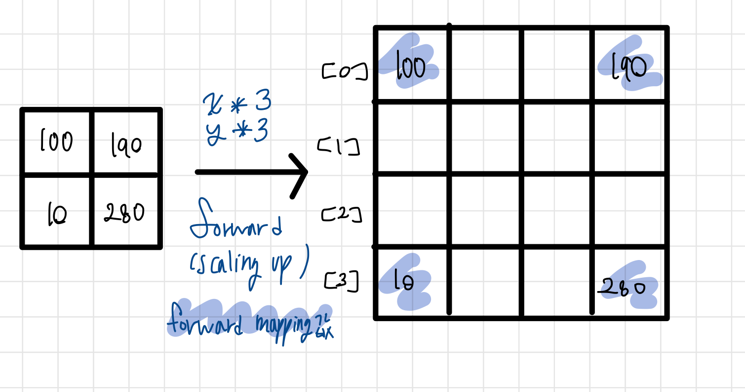 전방 변환 시, 매핑(mapping)이 되지 않는 홀(hole) 혹은 중첩(overlap)되는 픽셀이 생기는 문제점이 있음