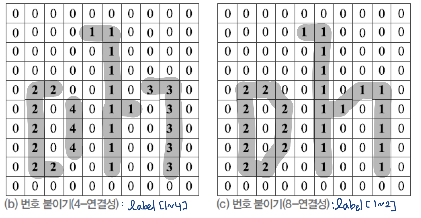- Component Labeling : 이진 영상을 덩어리진 컴포넌트 별로 독립된 레이블을 부여
