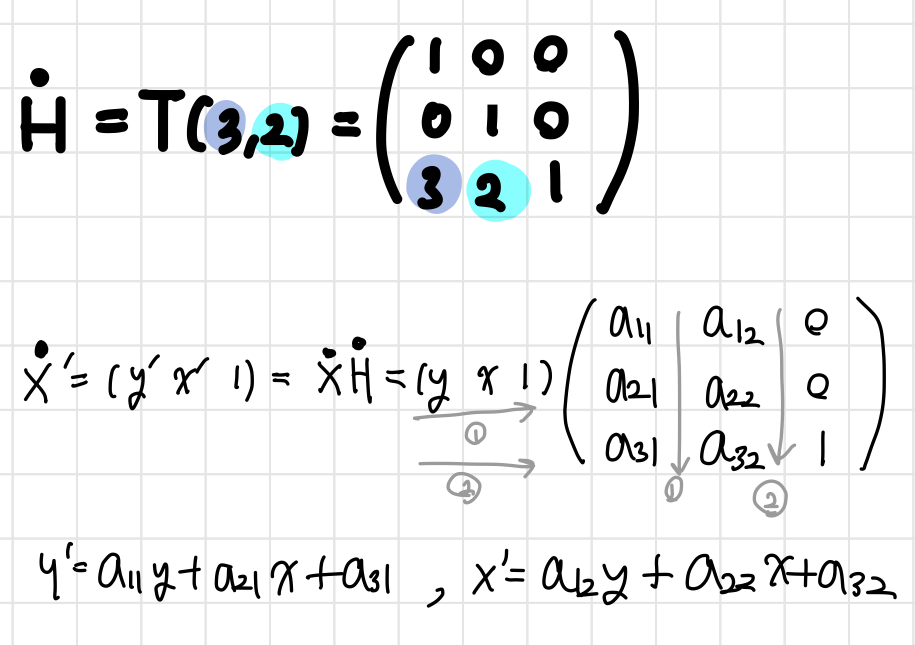 - 예1: 어떤 점을 y방향으로 3, x방향으로 2만큼 이동시키는 동차 행렬 $\dot{H}$는 다음과 같다