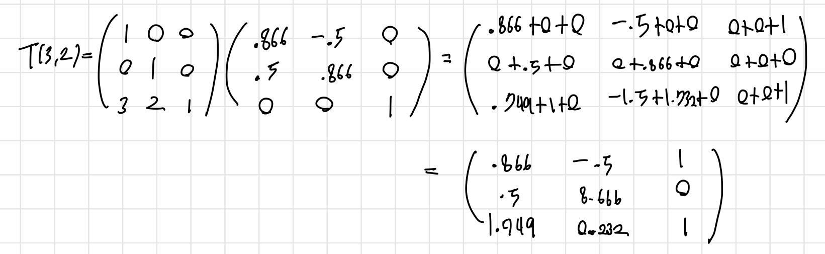 - 위의 예제에서 변환에 필요한 행렬 T(3,2)와 R(30도)를 곱해 세 꼭지점에 각각에 대해 적용할 수 있다