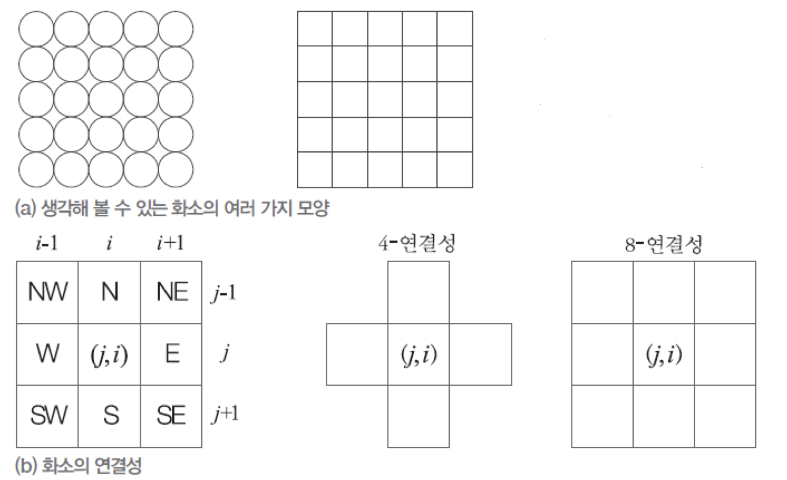 - 4-연결성 (4-connectivity), 8 연결성(8-connectivity)