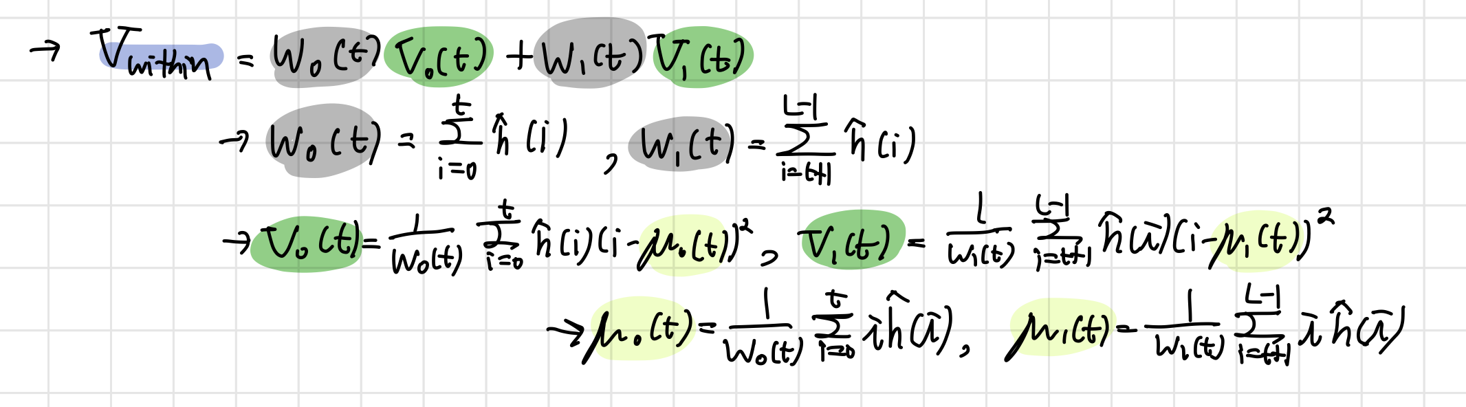 - 따라서 최대화 문제를 $T = argmax V_{between}(t)$, $t \in [0,1,...,L-1]$로 바꿀 수 있다