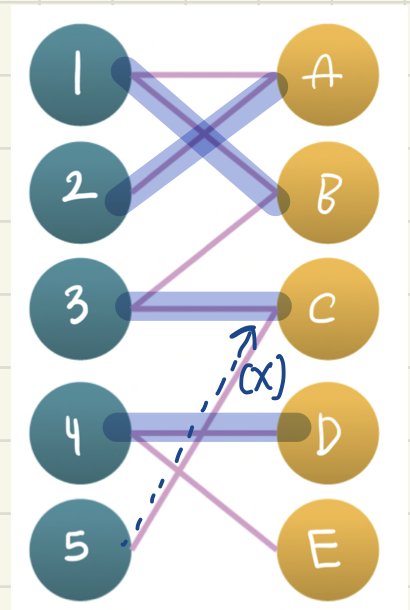 - 노드5에서 C 방문 -> 이미 <노드3-C>가 매칭된 상황
