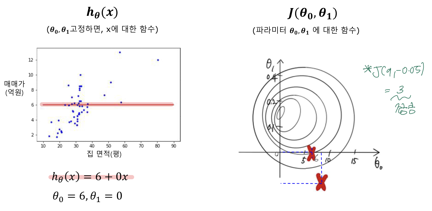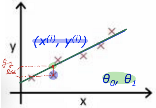 학습 예제 (x,y)의 y와 $h_\theta(x)$가 잘 맞도록 $\theta_0, \theta_1$을 선택하자 ($h_\theta(x)$는 $\hat{y}$라고도 함)