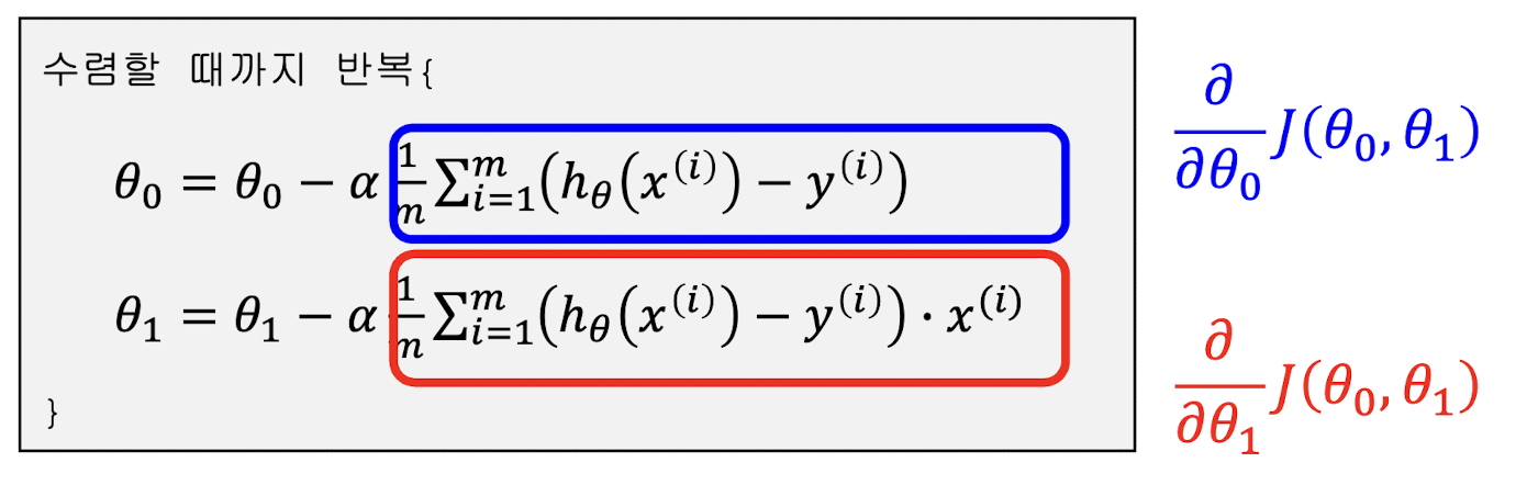 - 경사 하강법 알고리즘: 수렴할 때까지 $\theta_j = \theta_j - \alpha\frac{\partial}{\partial\theta_j}J(\theta_0,\theta_1)$, (for j=0 and j=1) 반복