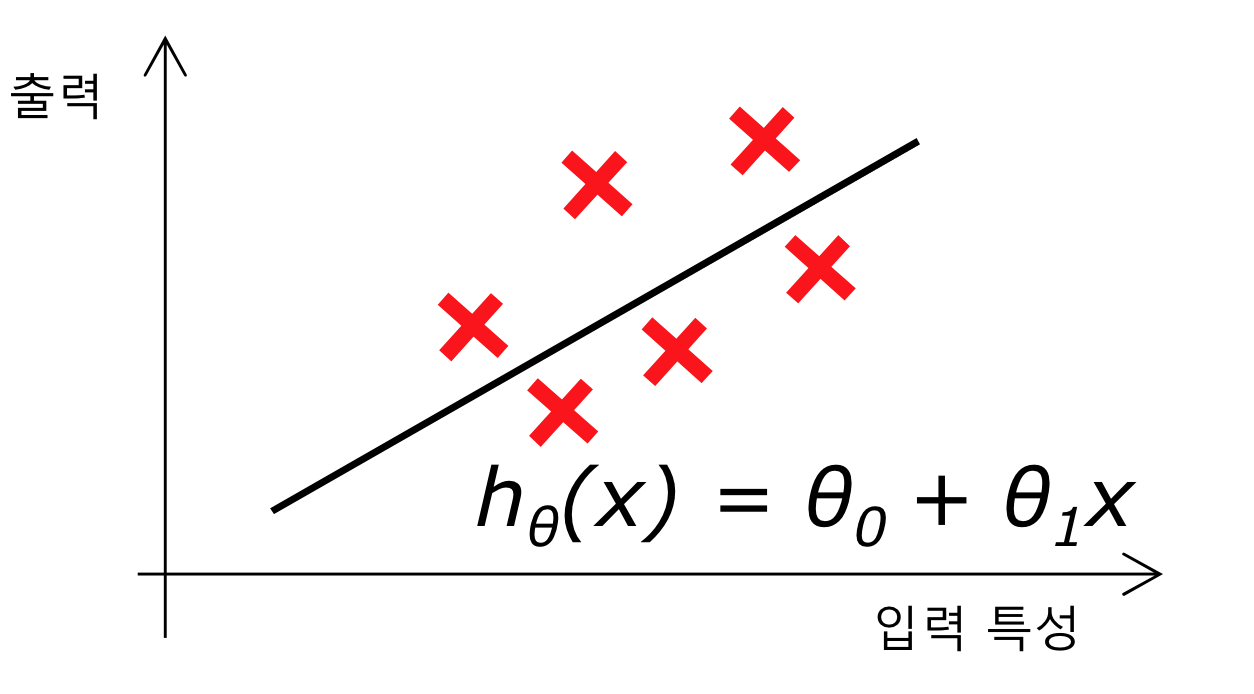 여기서 h는 단항 선형 회귀 모델 - h 표현 방식 : $h_\theta(x) = \theta_0 + \theta_1x$, 줄여서 $h(x)$
