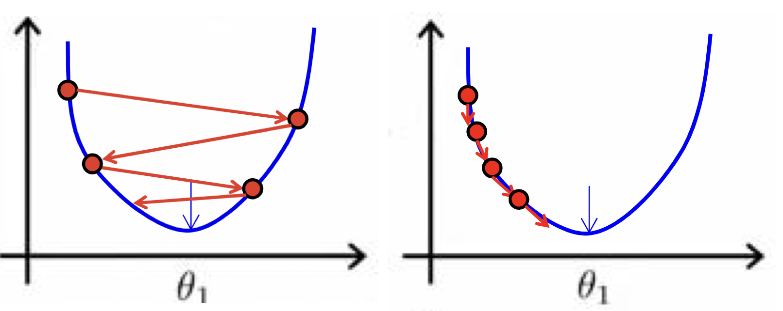alpha가 너무 큰 경우(좌), alpha가 너무 작은 경우(우) - $\alpha$가 너무 큰 경우, 최소값을 지나칠 수 있음. 즉 수렴에 실패하게 되고 발산하기도 함
