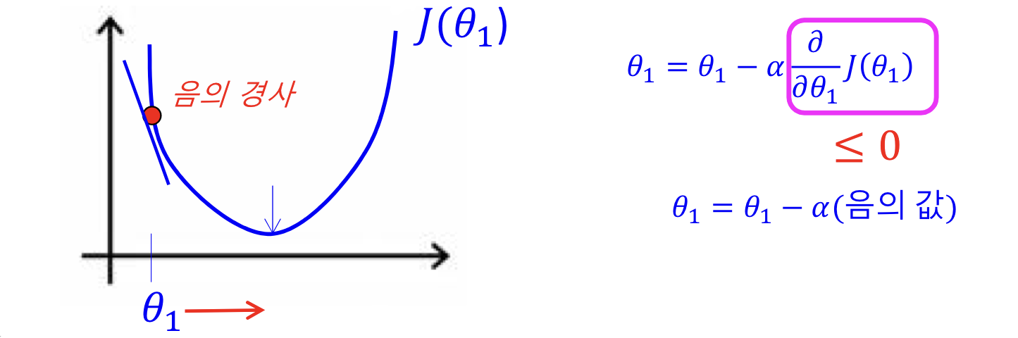 - 음의 경사인 경우, $\theta_1$ 이 양의 방향으로 이동