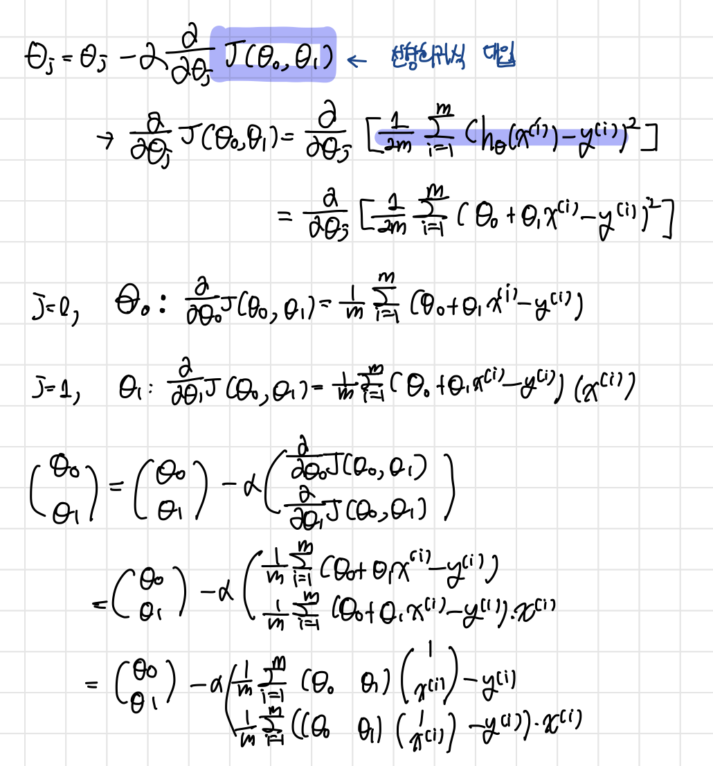 - $\frac{\partial}{\partial\theta_j}J(\theta_0,\theta_1)$ : 변화율 -> 미분(derivative)