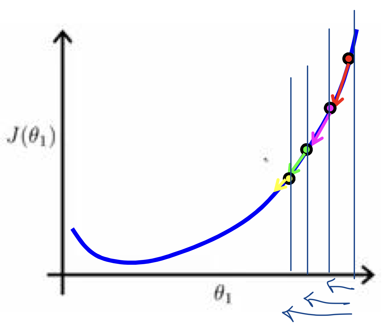 - 지역적 최소값에서 기울기 즉, $\frac{\partial}{\partial\theta_1}J(\theta_1)=0$임