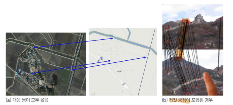 - 특징 벡터가 개별적으로 매칭을 수행->이상치(outlier<->inline) 매칭 (거짓긍정) 발생