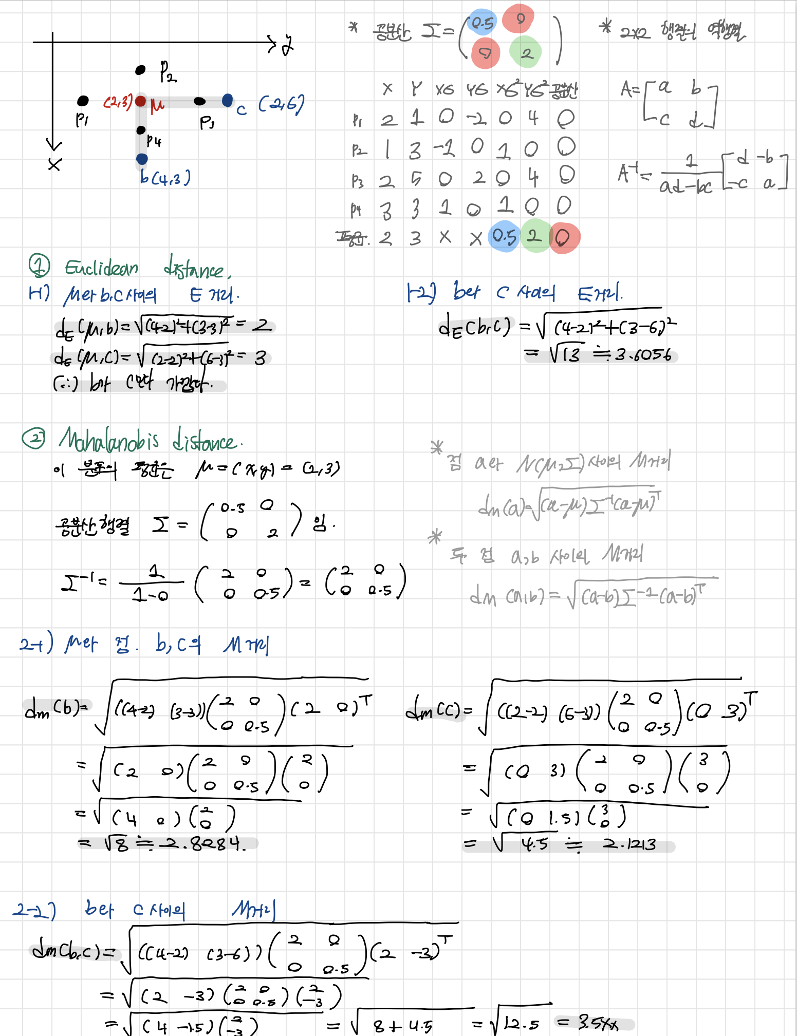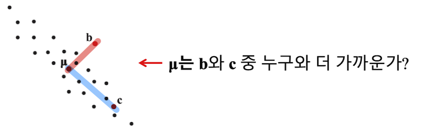 - $\mu$와 b, c의 거리를 각각 유클리디안, 마할라노비스 거리로 계산해보자
