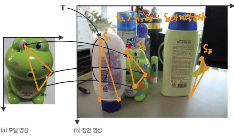 - 두 영상의 특징 벡터를 $a_i (i=1,2,\cdots,m), b_j (j=1,2,\cdots,n)$라 표기할 때, 아래 식을 만족하면 매칭 성공