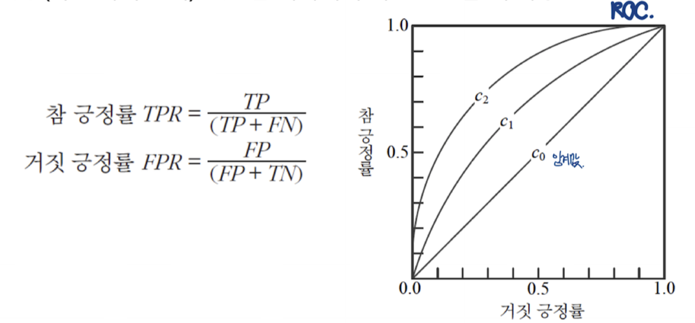- T를 점점 키우면서 측정한 거짓 긍정률과 참 긍정률을 나타낸 그래프가 ROC