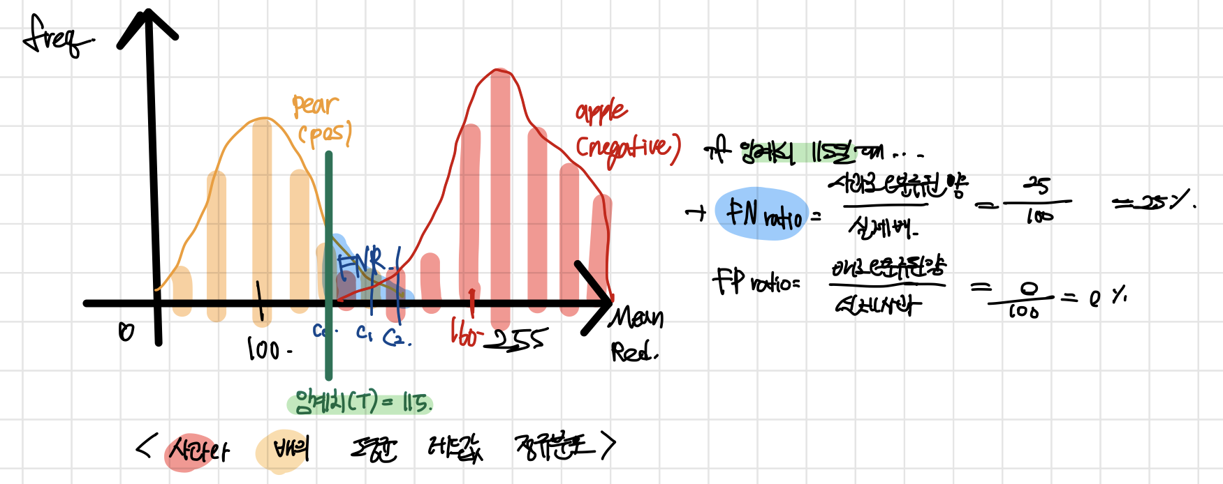 - 임계값 T가 낮으면 거짓부정(FN)이 많아지고, 높으면 거짓긍정(FP)이 많아짐