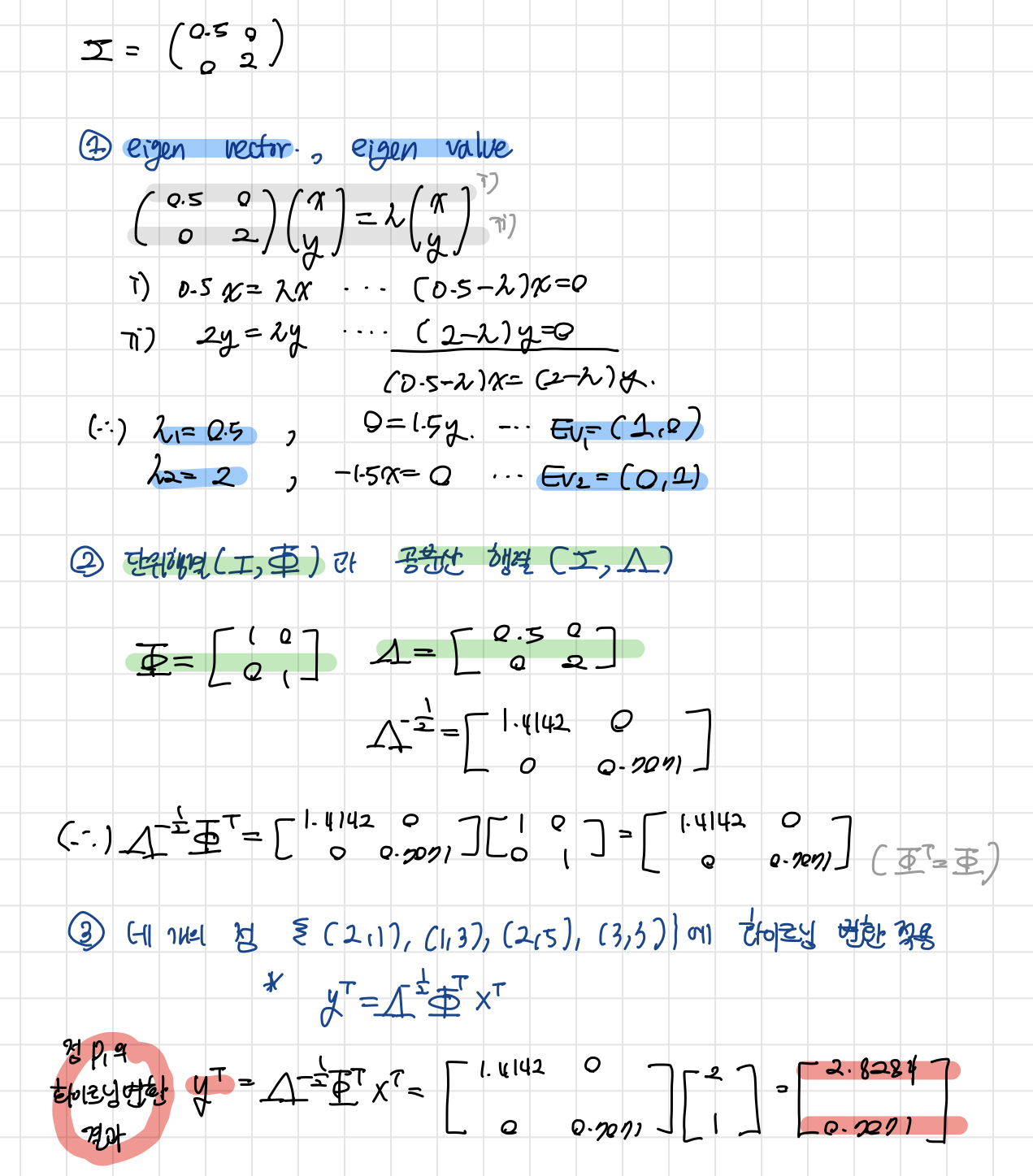 - 공분산 행렬이 단위 행렬 I가 되도록 원래 백터 x를 y로 변환