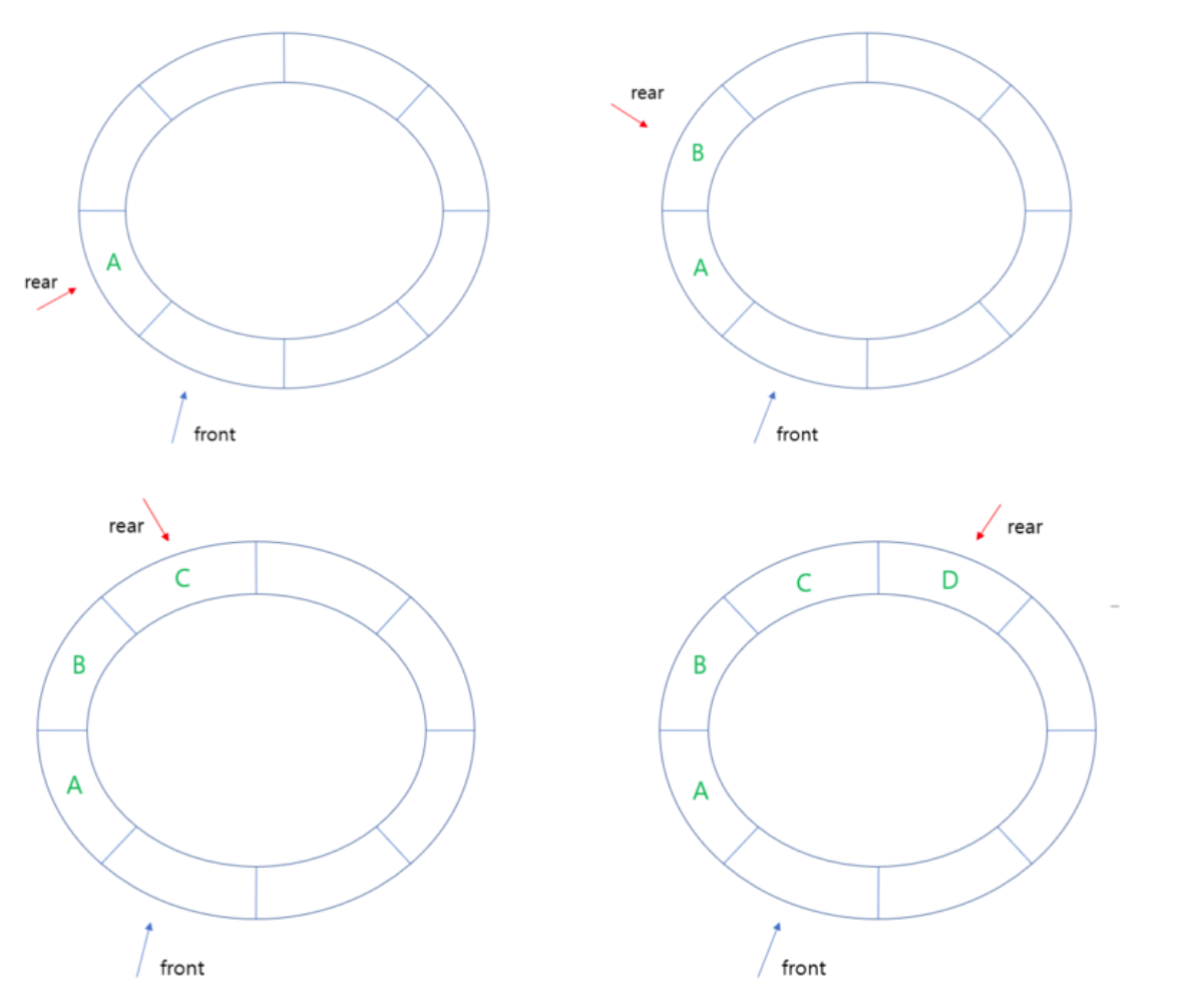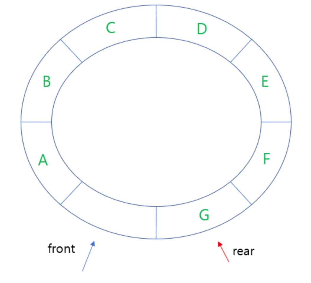 앞에서, 공백 상태를 front == rear로 구분하기 때문에 포화상태의 경우 위의 사진처럼 한 칸이 비어있다.