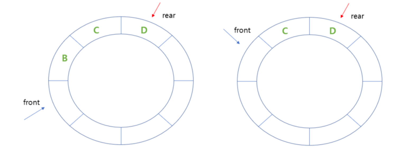 front에서 삭제가 일어날 경우, rear 값의 변경이 없고 front += 1을 하며 데이터를 삭제한다