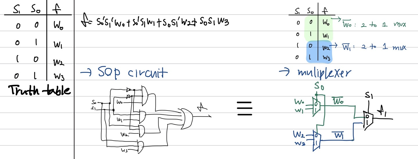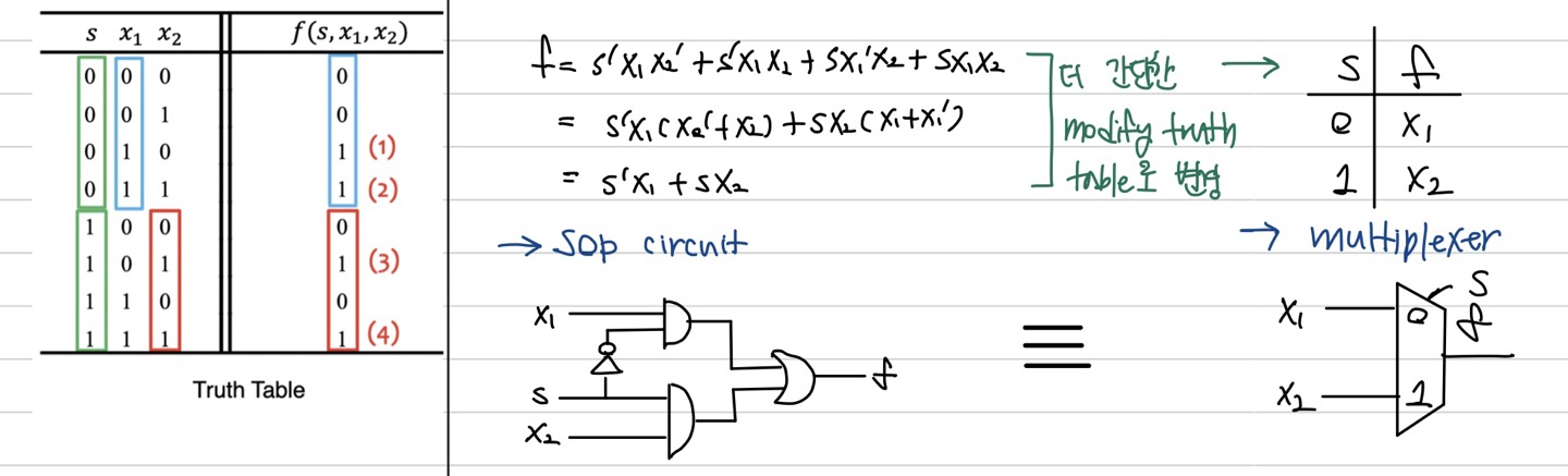 - 같은 Truth table에 대해서 SOP(sum of product)가 아닌 Multiplexer로 구현할 경우 더 간단하게 회로 구현 가능