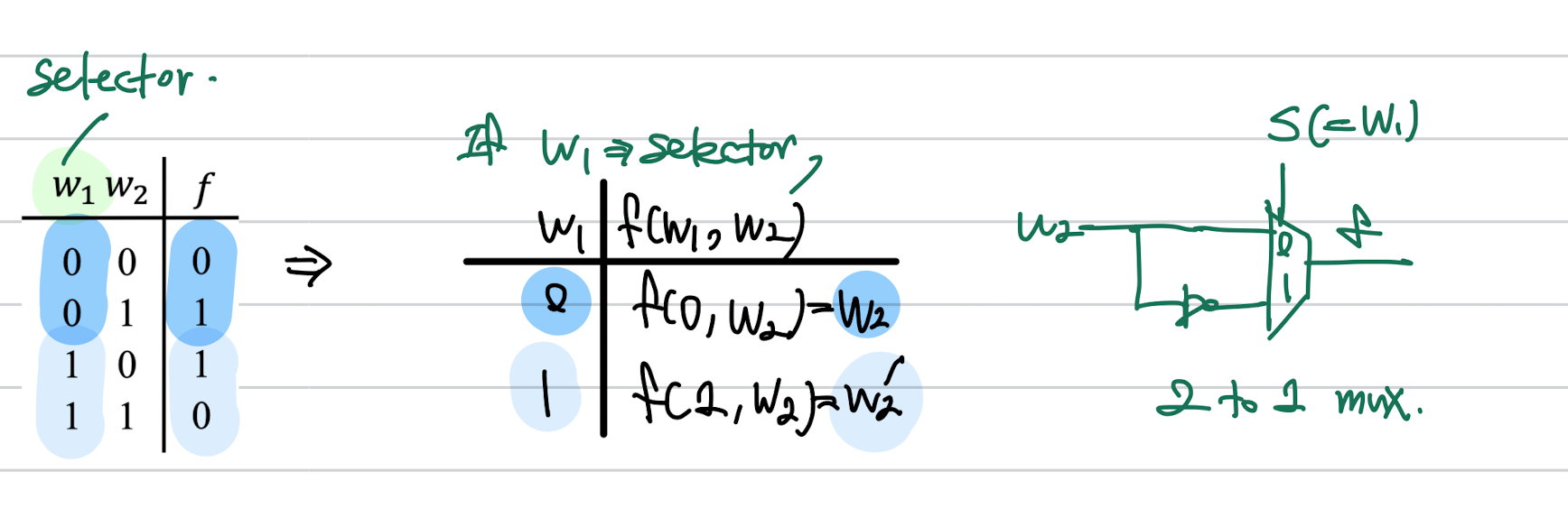- 기존의 복잡한 회로를 MUX로 간단하게 구현하기 위해서는 selection bit를 잘 골라야 함