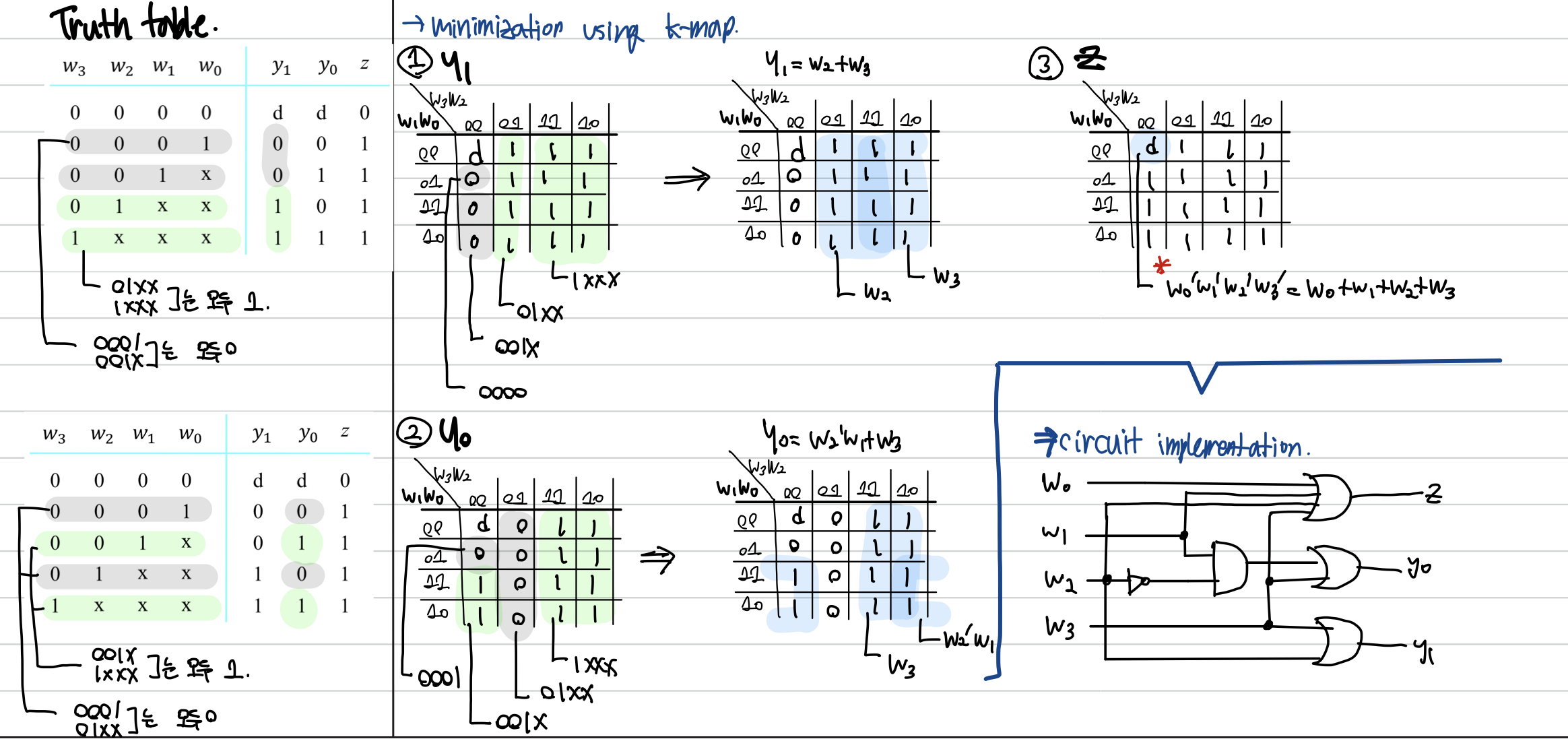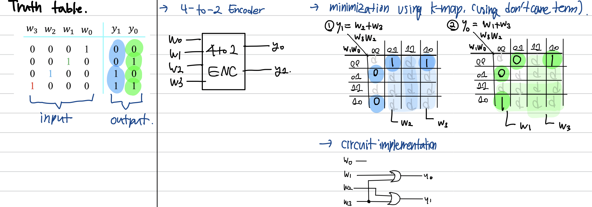두 개 이상의 입력이 동시에 '1'이여도 출력은 더 높은 우선순위를 가지는 입력 $w_i$에 해당하는 이진 코드가 됨
