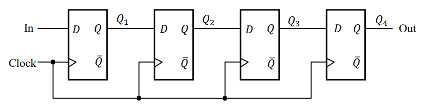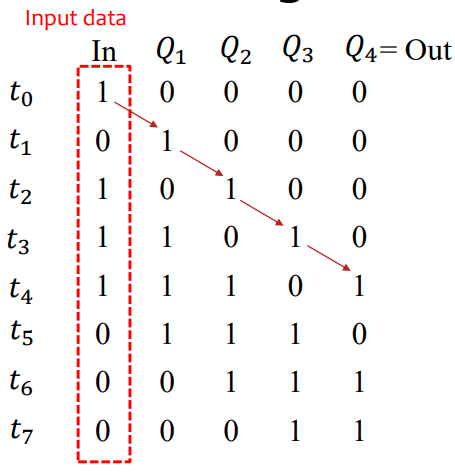 - 일련의 지연소자(D 플립플롭)들로 구성됨