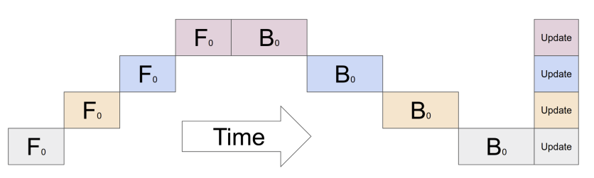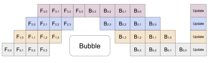 위 그림에서는 이 문제를 완화하기 위해 입력 미니 배치를 여러 마이크로 배치로 분할하고 이를 여러 GPU에서 실행하는 파이프 라인을 나타냅니다. 그림은 4개의 다른 GPU(세로출)에 4개의 레이어가 배치 된 모델을 나타냅니다. 수평 축은 기본 모델 병렬화보다 GPU가 훨씬 더 효율적으로 활용되고 있음을 보입니다. 하지만 여전히 특정 GPU가 사용되지 않는 거품(Bubble)이 존재합니다.