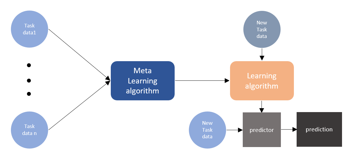 Meta learning은 학습하는 방법을 학습합니다. 이는 여러 개의 task를 동시에 학습하고 각 task간의 차이도 학습하며 이루어집니다. 전체 학습 이후에 적은 데이터(few-shot)로도 추론할 수 있는 범용적인 모델을 생성하게 됩니다.