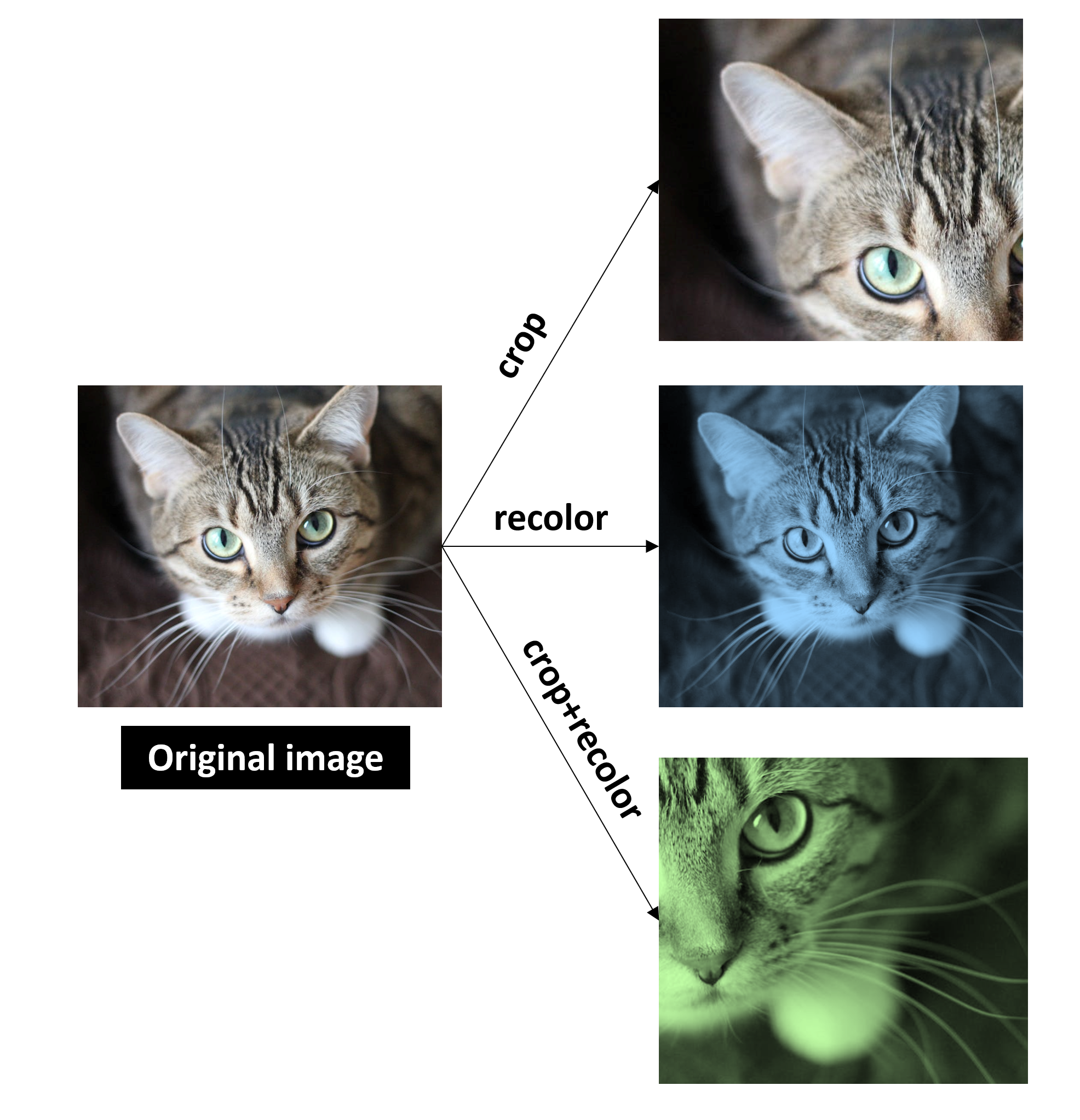 - 먼저 crop, resize, color distribution, grayscale 등 임의의 조합을 랜덤하게 수행해 data augmentation을 진행합니다.