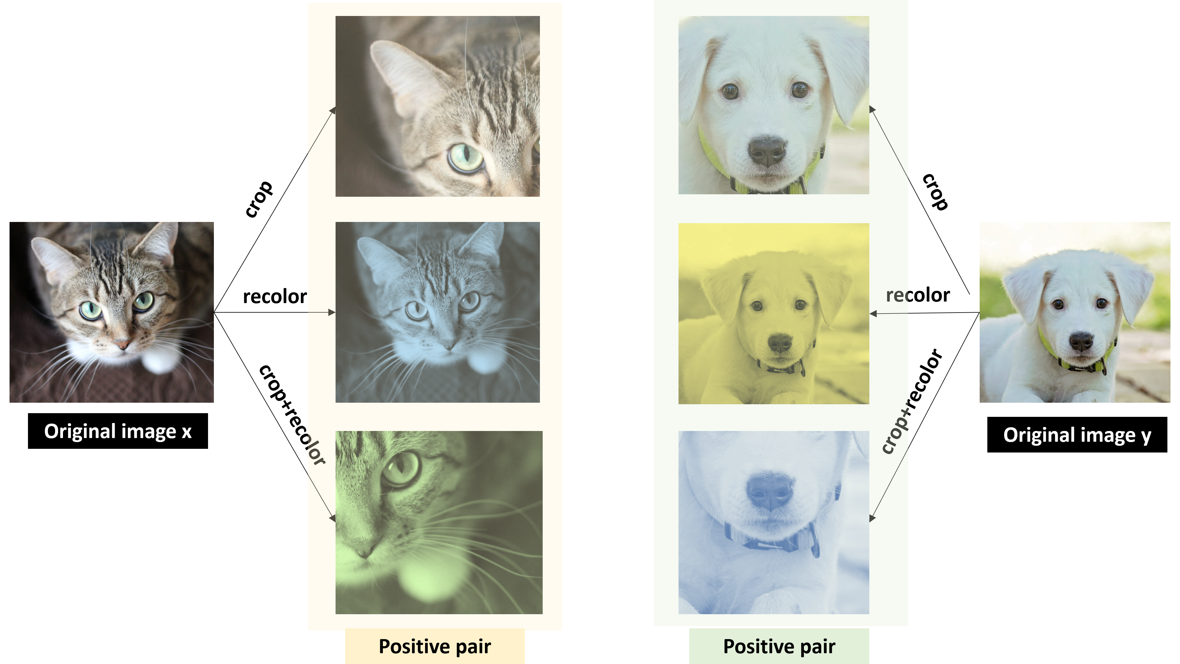 - 증강된 이미지들은 동일한 이미지에서 나왔기 때문에 모델이 해당 이미지들을 서로 유사하다고 학습해야 합니다. 즉, 같은 이미지에서 증강된 이미지들끼리는 positve pair, 다른 이미지에서 증강된 이미지들끼리는 negative pair로 설정할 수 있습니다.