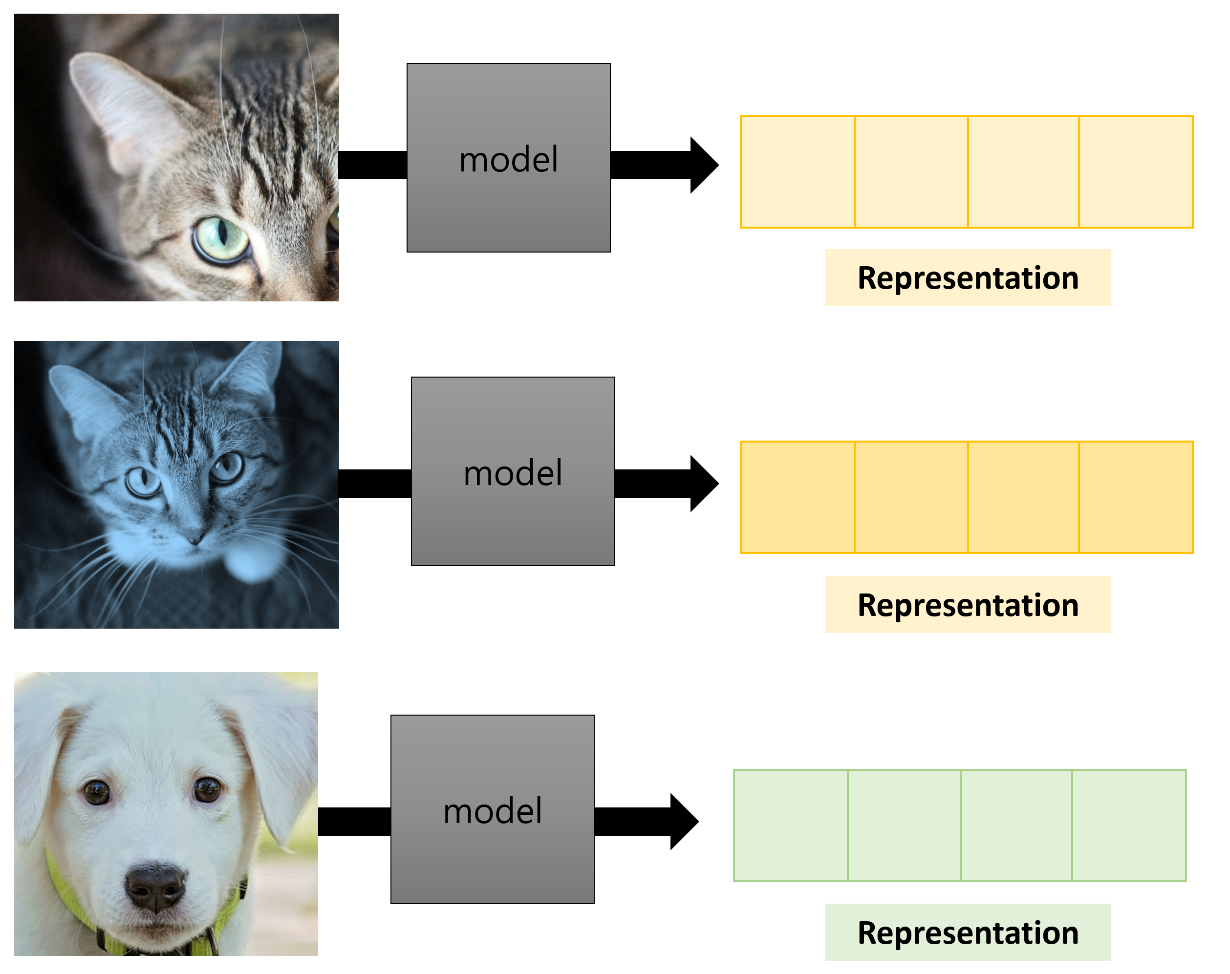 - 벡터 공간상에서 positive pair들끼리는 가깝게, negative pair들끼리는 멀게 학습해야합니다. 즉 아래의 그림에서처럼, representation을 뽑는 모델은  고양이 사진끼리는 비슷한 representation을, 강아지와는 다른 representation을 생성하도록 학습해야 합니다.