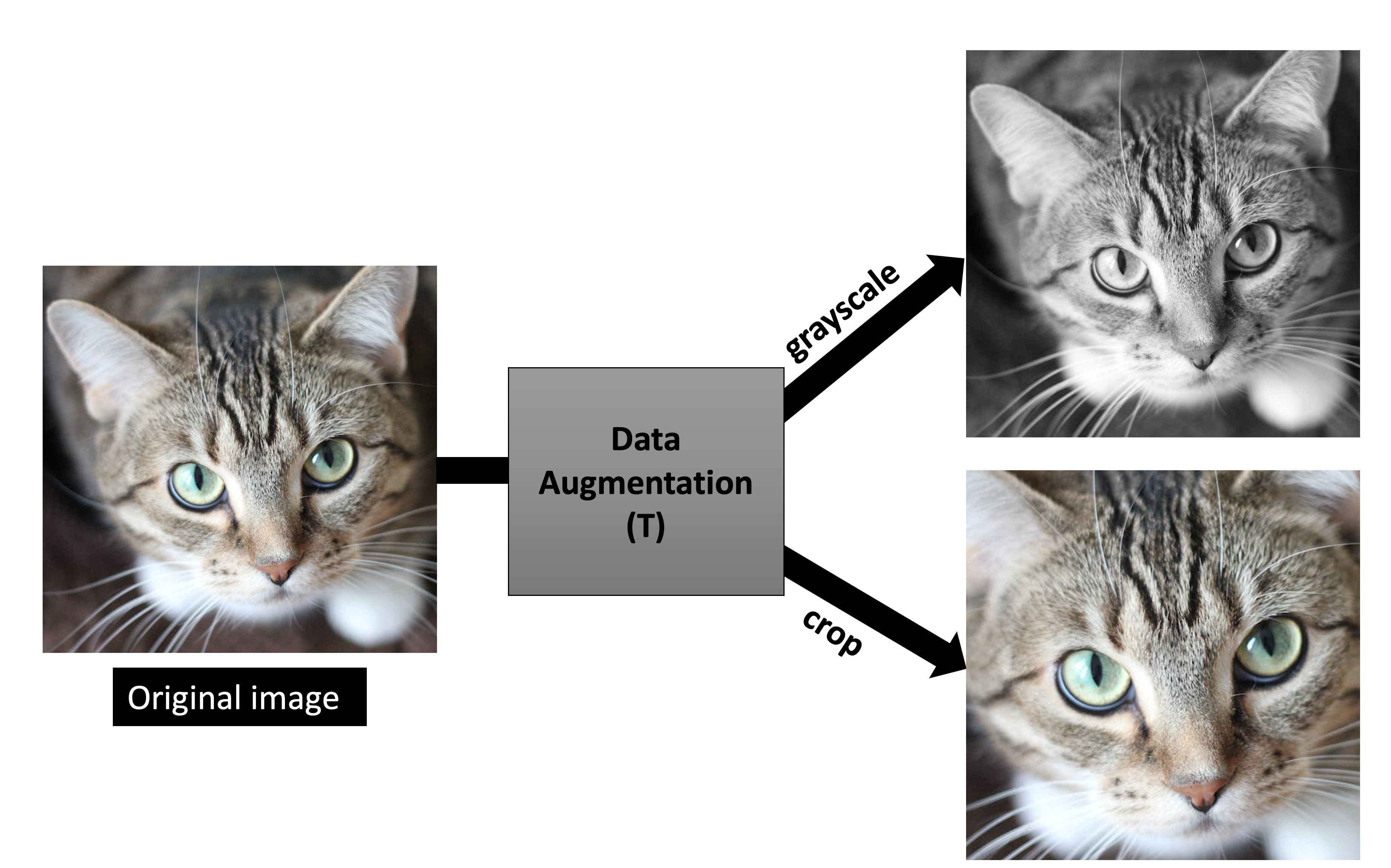 - 이는 배치(batch)마다 한 이미지에서 두 번씩 수행이 되어 두 개의 증강된 이미지를 만듭니다. 즉, positive pair를 생성하게 됩니다. 아래의 그림에서는 랜덤하게 grayscale, resize가 원본 이미지로부터 새롭게 생성된 이미지가 positive pair를 이루게 됩니다.