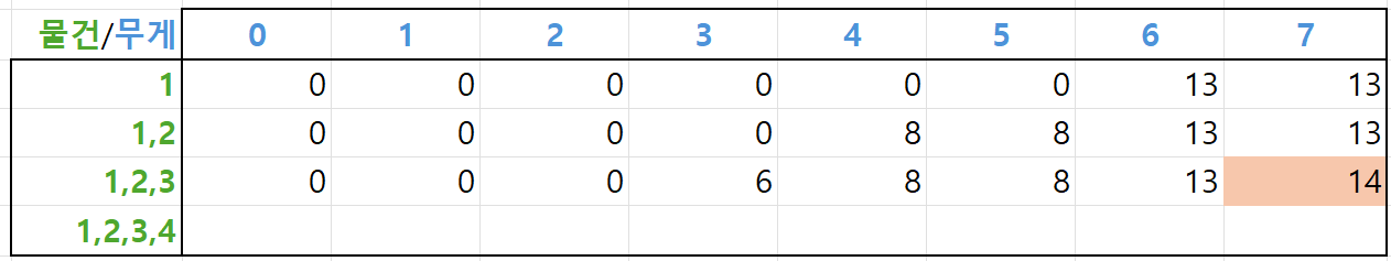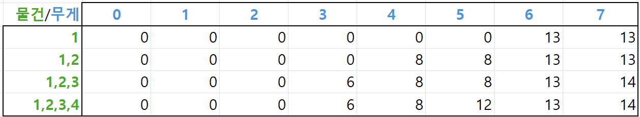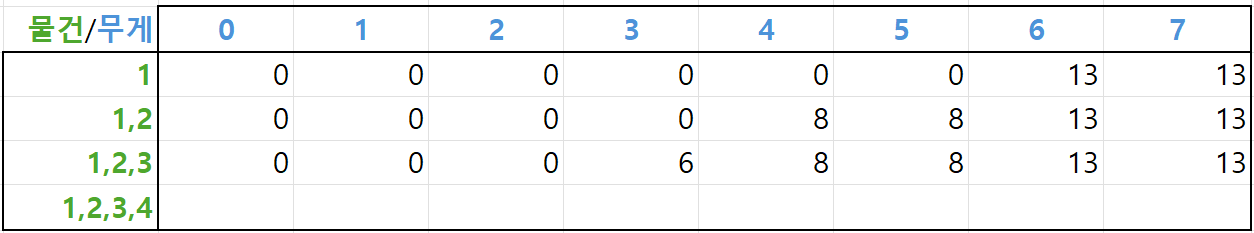 네 번째 물건까지 담을 수 있을 때를 모두 계산한 결과는 다음과 같습니다.