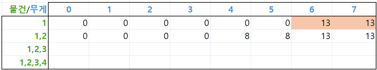 최대 6kg까지 배낭에 담을 수 있을 때는, 첫 번째 물건과 두 번째 물건 중 하나만을 선택해 담을 수 있으므로 두 물건의 가치를 비교해서 더 큰 가치를 가진 물건을 넣어주면 됩니다. 첫 번째 물건의 가치가 13으로 더 크므로, arr[2][6]~arr[2][7]는 13을 저장해줍니다.