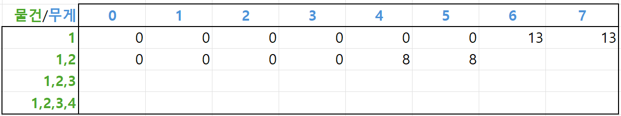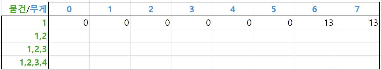 첫 번째 물건의 무게는 6kg로, arr[1][0]~arr[1][5] 는 물건을 담을 수 없어 최대가치가 0, arr[1][6]~arr[1][7] 부터는 물건을 담을 수 있으므로 첫 번째 물건의 가치인 13이 저장됩니다.