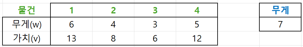 왼쪽의 배열은 i번째 물건의 무게(w), 가치(v)이며, 오른쪽은 최대 배낭이 버틸 수 있는 무게인 7kg입니다.