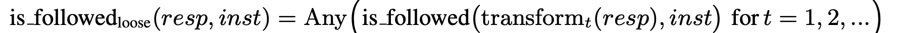LLM의 원본 응답을 resp라고 할 때, transform함수를 사용해 응답을 t 번 변형하여, 그 중 한 번이라도 지시문을 만족할 경우 점수를 주는 방식입니다. 변형 방식은 응답에서 흔히 사용되는 마크다운 태크(*,**) 제거, 서두/결론 제거 등이 있습니다.