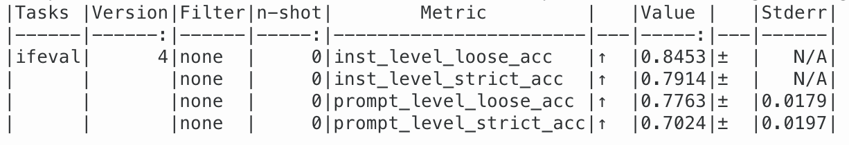 설치가 정상적으로 되었다면, 아래의 명령어로 원하는 모델의 ifeval 성능을 확인할 수 있습니다.