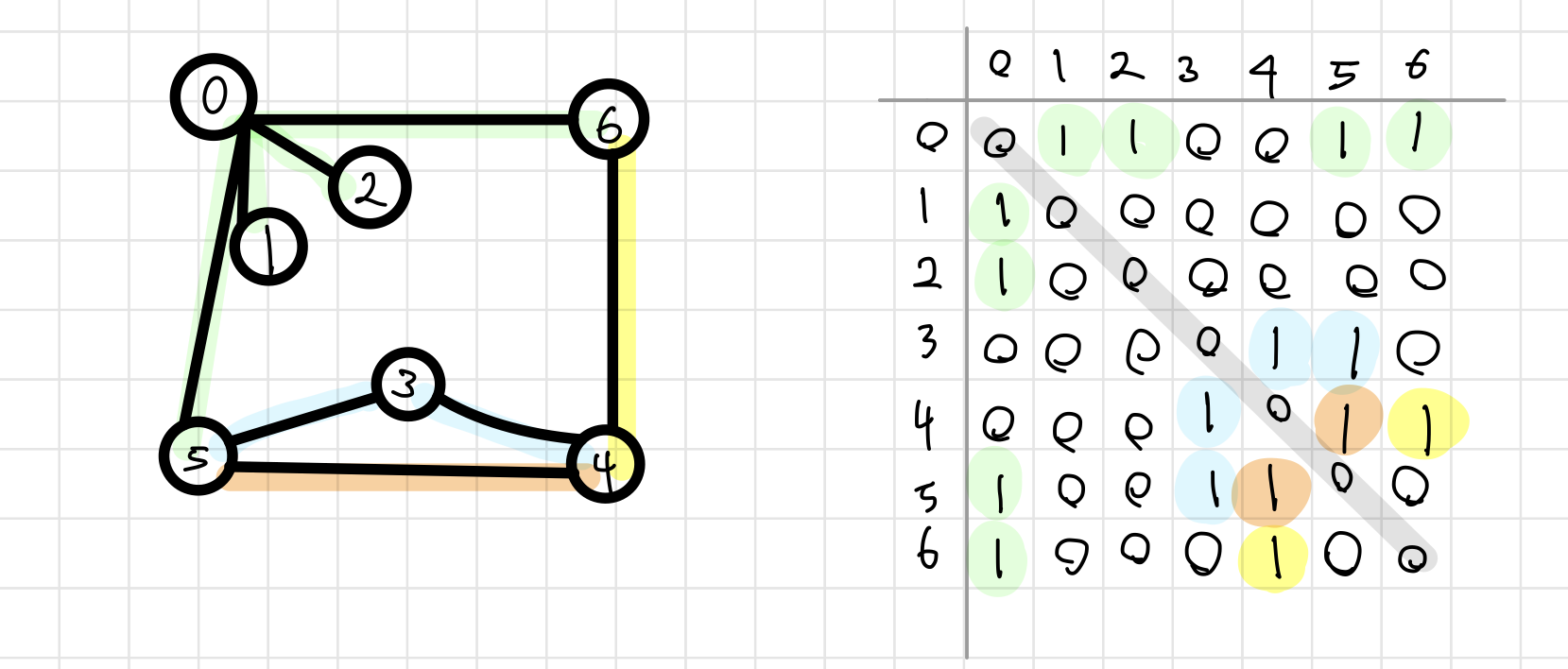 - 행 번호와 열 번호는 그래프의 정점에 대응하며 두 정점이 인접되어 있으면 1, 그렇지 않으면 0으로 표현
