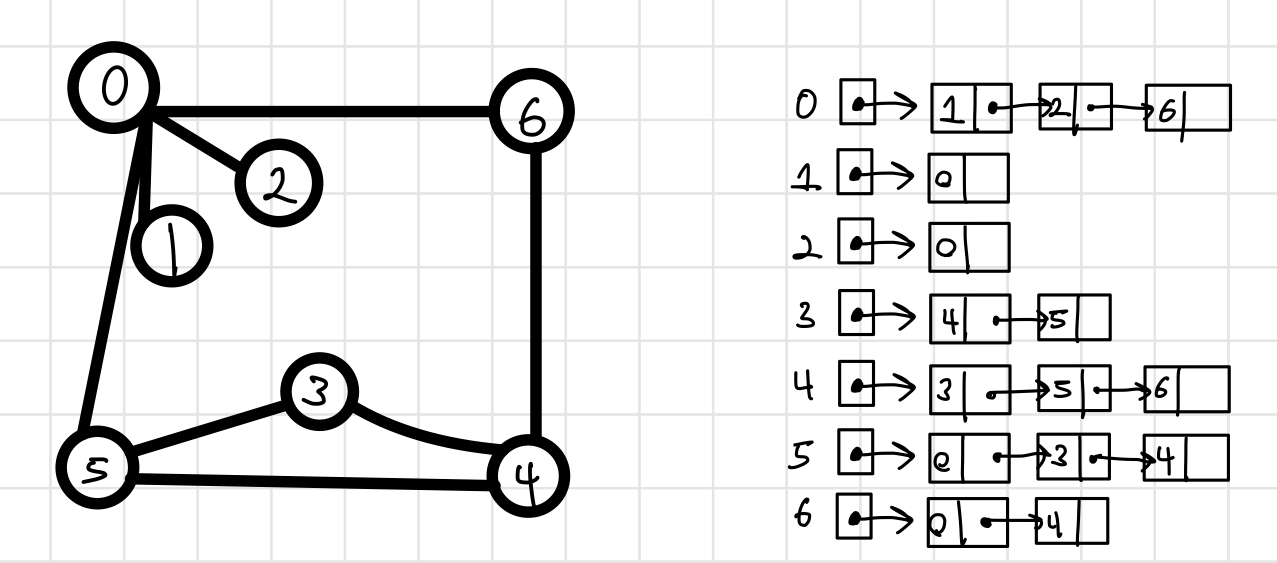 - 각 정점에 대한 인접 정점을 개수만큼 저장하고 각각 노드로 하는 리스트로 저장함