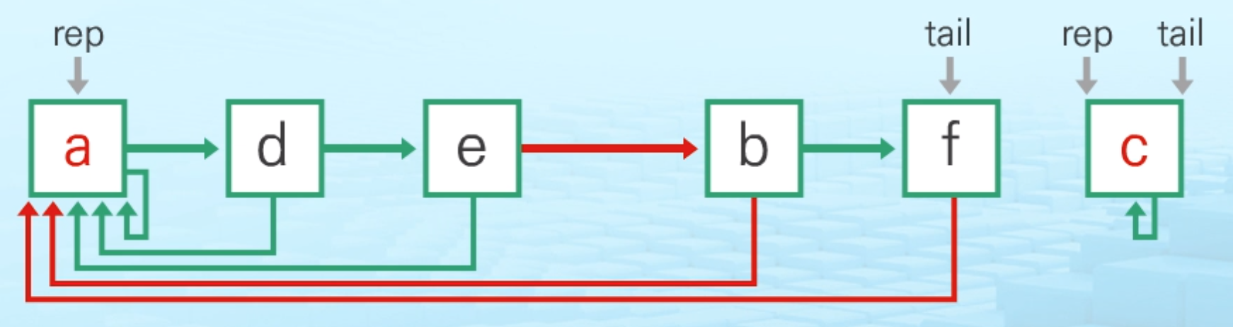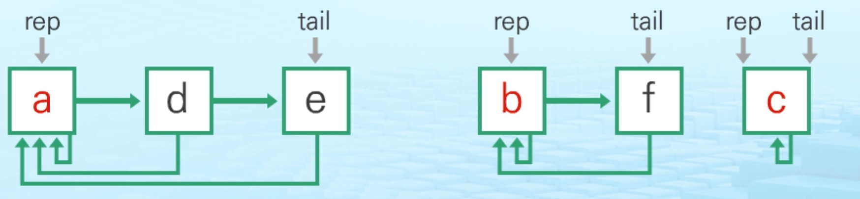 - 각 원소는 집합의 대표 원소를 가리키는 링크를 가짐
