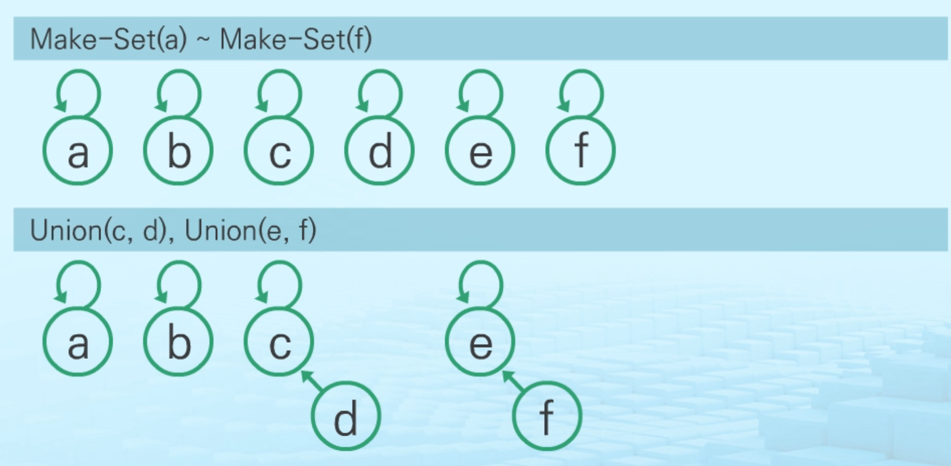 Make-Set(x): 원소 x만으로 구성된 집합을 생성하는 연산