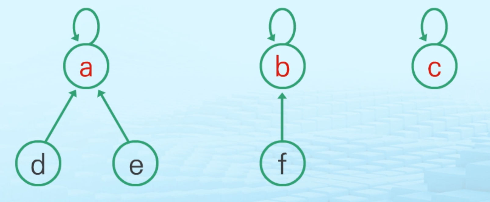 - 자식 노드가 부모 노드를 가리키며 루트 노드가 집합의 대표자가 됨
