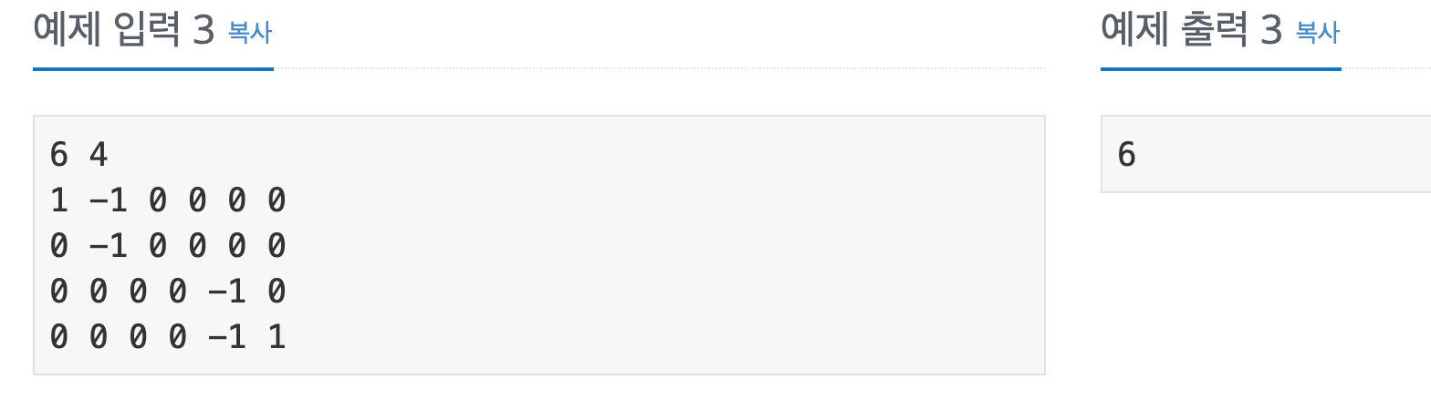 첫 줄에는 상자의 크기를 나타내는 두 정수 M,N이 주어진다. M은 상자의 가로 칸의 수, N은 상자의 세로 칸의 수를 나타낸다. 단, 2 ≤ M,N ≤ 1,000 이다. 둘째 줄부터는 하나의 상자에 저장된 토마토�